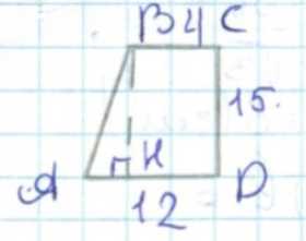 Сначала вычислим разность радиусов: \(12 — 4 = 8\) см. Это расстояние по горизонтали между основаниями, которое является одним из катетов. Второй катет — это высота усечённого конуса, равная 15 см. Таким образом, мы имеем прямоугольный треугольник с катетами 8 см и 15 см.