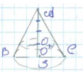 Высоту конуса разделили на 4 равных отрезка, значит точки деления находятся на высотах \( \frac{h}{4} \), \( \frac{2h}{4} = \frac{h}{2} \), \( \frac{3h}{4} \) от вершины конуса. Плоскости, проведённые через эти точки параллельно основанию, пересекают конус сечениями, которые являются кругами. Радиус каждого такого круга пропорционален расстоянию от вершины, так как конус сужается линейно. Если радиус основания равен \( r \), то радиус сечения на высоте \( h_i \) будет равен \( r_i = r \cdot \frac{h_i}{h} \).