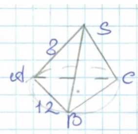 Сторона основания пирамиды равна 12 см, боковое ребро 8 см. Осевое сечение конуса — равнобедренный треугольник с боковыми сторонами 8 см.