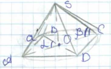 \(S = \pi r SC = \pi \cdot \frac{a}{\sqrt{2 — 2 \cos \alpha}} \cdot \frac{a}{\sqrt{2 — 2 \cos \alpha} \cos \beta} = \frac{\pi a^2}{(2 — 2 \cos \alpha) \cos \beta}\).