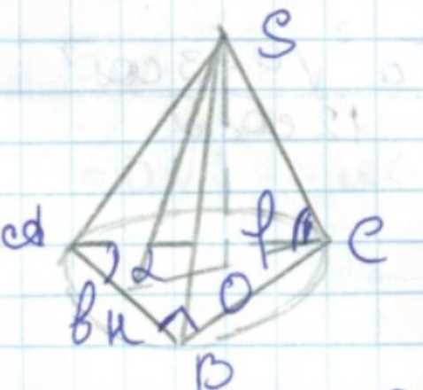 Далее, все боковые рёбра пирамиды наклонены к плоскости основания под углом \(\phi\). Это означает, что высота конуса, описанного около пирамиды, связана с радиусом основания и углом наклона. Высота конуса равна \(h = R \tan \phi = \frac{b}{2 \cos \alpha} \tan \phi\). Для вычисления площади боковой поверхности конуса необходимо найти длину образующей \(l\), которая является гипотенузой треугольника с катетами \(R\) и \(h\). По теореме Пифагора \(l = \sqrt{h^2 + R^2} = \sqrt{\left(\frac{b}{2 \cos \alpha} \tan \phi\right)^2 + \left(\frac{b}{2 \cos \alpha}\right)^2}\).