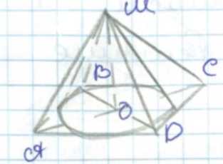 Поскольку конус вписан, то основание \(ABCD\) является вписанным четырёхугольником, для которого известно равенство сумм противоположных сторон: \(AB + CD = AD + BC\). Это свойство влияет на соотношение площадей треугольников, так как площадь треугольника с вершиной \(M\) и основанием на стороне четырёхугольника пропорциональна длине этой стороны при фиксированной высоте, проведённой из точки \(M\).