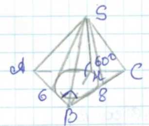 Основанием пирамиды является прямоугольный треугольник с катетами 6 см и 8 см. Все двугранные углы пирамиды при рёбрах основания равны 60°. Найдите площадь боковой поверхности конуса, вписанного в данную пирамиду.