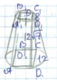 Около правильной усечённой четырёхугольной пирамиды описан усечённый конус. Найдите площадь боковой поверхности усечённого конуса, если стороны оснований усечённой пирамиды равны 8 см и 12 см, а её высота — \(2\sqrt{7}\) см.