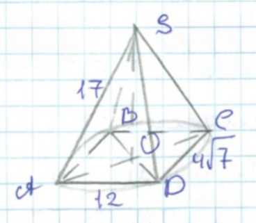 В треугольнике \(SOC\) по теореме Пифагора \(SO = \sqrt{17^2 — 8^2} = \sqrt{289 — 64} = 15\).