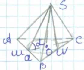 Двугранный угол при ребре основания равен \( \alpha \). Высота пирамиды \(SO_m\) опускается перпендикулярно на плоскость основания и связана с углом \( \alpha \) и длиной стороны основания. По геометрии пирамиды высота равна \(SO_m = \frac{a \sqrt{3}}{6 \cos \alpha}\). Это выражение получается из соотношения между наклонной высотой боковой грани и углом при ребре основания. Высота пирамиды также равна образующей конуса \(l\), так как вершина пирамиды совпадает с вершиной конуса, а основание конуса лежит в основании пирамиды.