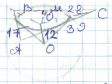 Стороны треугольника равны 17 см, 28 см и 39 см и касаются данной сферы. Расстояние от центра сферы до плоскости этого треугольника равно 12 см. Найдите радиус сферы.