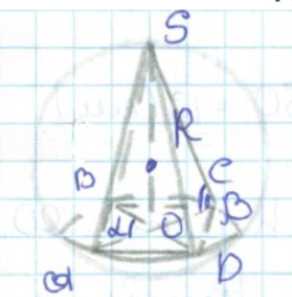 Рассмотрим правильную по наклону пирамиду над прямоугольником: все боковые рёбра образуют с плоскостью основания одинаковый угол \(\beta\), значит вершина лежит на перпендикуляре через центр прямоугольника. Центр прямоугольника является центром описанной окружности основания, поэтому проекции всех боковых рёбер на плоскость основания имеют равную длину и направлены к этому центру. Обозначим через \(O\) центр прямоугольника, через \(V\) вершину пирамиды, через \(A\) вершину основания. Тогда отрезок \(VA\) является боковым ребром, а \(R\) — радиус описанной вокруг всей пирамиды сферы, то есть \(R=VO\). Разложим \(VO\) на вертикальную составляющую (высоту пирамиды) и горизонтальную (радиус описанной окружности основания). Так как угол между ребром и плоскостью равен \(\beta\), для ребра длины \(VA\) имеем: высота \(h=VA\sin\beta\), горизонтальная проекция \(r=VA\cos\beta\). В прямоугольном треугольнике \(V A O\) гипотенуза \(VO=R\), а катеты равны \(h\) и \(r\), откуда \(R^{2}=h^{2}+r^{2}\). Выражая \(VA=\frac{h}{\sin\beta}=\frac{r}{\cos\beta}\), получаем \(R=\sqrt{h^{2}+r^{2}}=\sqrt{(VA\sin\beta)^{2}+(VA\cos\beta)^{2}}=VA\). Следовательно, фактически \(VA=R\), а горизонтальная проекция любого бокового ребра на плоскость основания имеет длину \(r=R\cos\beta\), а высота равна \(h=R\sin\beta\).