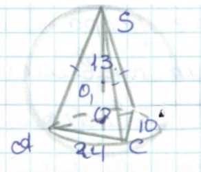 Боковые рёбра равны, значит вершина \( S \) находится над серединой гипотенузы \( O \), расстояние \( AO = 13 \) см.