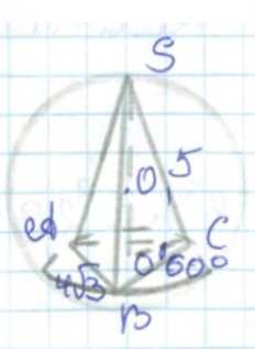 Высота пирамиды \(SO\) найдётся из прямоугольного треугольника с гипотенузой бокового ребра \(SE = 5\) см и катетом \(OE = R = 4\) см: \(SO^2 = SE^2 — OE^2 = 25 — 16 = 9\), значит \(SO = 3\) см.