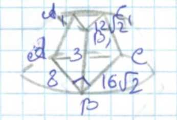 Даны стороны основания и высота: \(n = 8\), \(m = 16\sqrt{2}\), \(h = 3\).