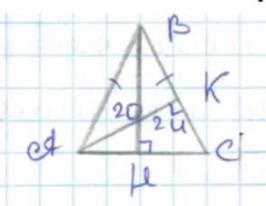 В равнобедренном треугольнике \( ABC \) с основанием \( AC \) и боковой стороной \( BC \) даны высоты: к основанию \( AC \) высота равна \( 20 \) см, а к боковой стороне \( BC \) — \( 24 \) см. Обозначим длину основания через \( a \), а боковой стороны через \( b \). Площадь треугольника можно выразить через основание и высоту, а также через боковую сторону и соответствующую ей высоту. Формулы площади будут выглядеть так: \( S = \frac{1}{2} a h_a \) и \( S = \frac{1}{2} b h_b \), где \( h_a = 20 \), а \( h_b = 24 \).