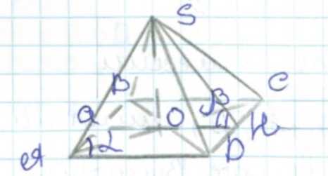 Двугранные углы при рёбрах основания равны \(\beta\). Двугранный угол — это угол между двумя плоскостями, в нашем случае между основанием и боковой гранью пирамиды. Чтобы понять, как связана высота пирамиды с этим углом, рассмотрим вертикальный срез пирамиды, проходящий через одно из рёбер основания. В этом сечении видно, что высота пирамиды \(h\) и половина стороны основания \(\frac{a}{2}\) образуют прямоугольный треугольник, где угол при основании равен половине двугранного угла \(\frac{\beta}{2}\). Это связано с тем, что двугранный угол делится пополам линией, проходящей через высоту пирамиды.