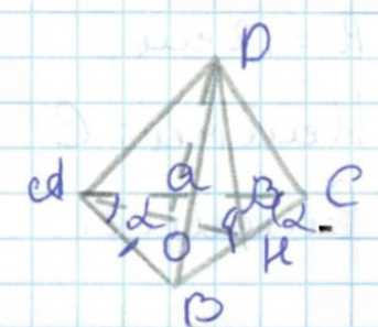 Дано: \(AB = BC\), \(AC = a\), \(\angle BAC = \alpha\), двугранные углы при рёбрах основания равны \(\beta\).