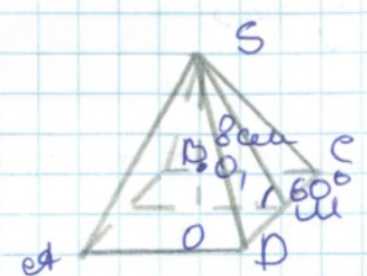 Шар вписан в правильную четырёхугольную пирамиду и касается одной из боковых граней в точке \(A\). Центр шара \(O\) находится внутри пирамиды, и расстояние от вершины пирамиды \(S\) до центра шара равно 8 см, то есть \(SO = 8\). Поскольку шар касается боковой грани, радиус \(r\) шара перпендикулярен к этой грани в точке касания \(A\). Это значит, что радиус направлен внутрь пирамиды и образует прямой угол с плоскостью боковой грани.