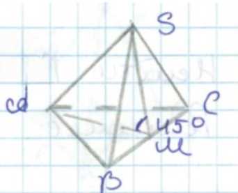 Дан двугранный угол при ребре основания правильной треугольной пирамиды равный \(45^\circ\). Этот угол — угол между двумя боковыми гранями, сходящимися по ребру основания. В правильной треугольной пирамиде основание — равносторонний треугольник со стороной \(a\), а высота пирамиды \(h\) связана с этой стороной и двугранным углом. Половина двугранного угла равна \(22{,}5^\circ\), и по определению тангенса половины угла можно записать соотношение: \(\tan 22{,}5^\circ = \frac{h}{\frac{a \sqrt{3}}{2}}\). Это выражение связывает высоту пирамиды и сторону основания.