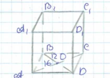 Основание призмы — ромб с диагоналями 16 и 12 см. Сторона ромба \( AB = \sqrt{(16/2)^2 + (12/2)^2} = \sqrt{8^2 + 6^2} = 10 \) см.