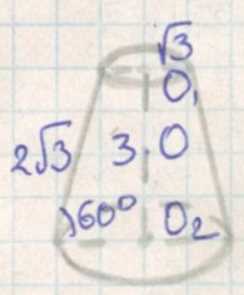 Дано: образующая \(l = 2\sqrt{3}\), радиус меньшего основания \(r = \sqrt{3}\), угол между образующей и большим основанием \(60^\circ\).