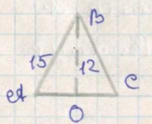 Площадь треугольника \( S = \sqrt{18(18-12)(18-9)(18-15)} = \sqrt{18 \cdot 6 \cdot 9 \cdot 3} = 54 \).
