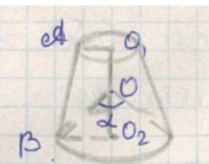 Если в усечённый конус вписан шар радиуса \(R\), то центр шара расположен так, что расстояния от него до оснований и боковой поверхности связаны с размерами конуса. Из центра шара диаметр большего основания виден под углом \(\alpha\). Это значит, что если рассмотреть треугольник с вершиной в центре шара и основанием, равным диаметру большего основания, угол при вершине равен \(\alpha\). В таком треугольнике половина диаметра больше основания равна \(r_1\), а расстояние от центра шара до большего основания обозначим \(d\). Тогда \(\tan \frac{\alpha}{2} = \frac{r_1}{d}\).