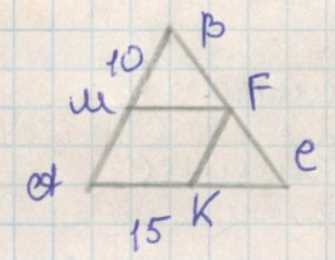 Обозначим сторону ромба через \(x\), тогда \(AM = MF = x\). Поскольку \(AB = 10\) см, длина отрезка \(MB\) равна \(10 — x\). Сторона \(AC = 15\) см. По признаку подобия треугольников можно записать равенство отношений: \(\frac{MB}{AB} = \frac{MF}{AC}\), то есть \(\frac{10 — x}{10} = \frac{x}{15}\). Это уравнение связывает сторону ромба \(x\) с известными сторонами треугольника.