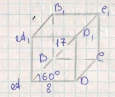 Далее нам известно, что меньшая диагональ призмы равна 17 см. В прямой призме высота равна длине ребра, перпендикулярного основанию, то есть высота \(h = 17\) см. Объём прямой призмы вычисляется как произведение площади основания на высоту: \(V = S \cdot h\). Подставляем найденные значения: \(V = 32 \sqrt{3} \cdot 15\).