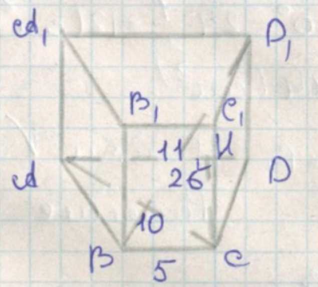 Площадь основания — это площадь трапеции \(BCAD\). Чтобы найти её, нужно знать длины оснований и высоту трапеции. Длины оснований — это отрезки \(BC = 5\) см и \(AD = 11\) см. Высота трапеции — это длина отрезка \(CM\), перпендикулярного основаниям. Длина \(CM\) вычисляется из прямоугольного треугольника \(ACM\) по теореме Пифагора: \(CM^2 = AC^2 — AM^2\), где \(AC = 10\) см, \(AM = 8\) см. Подставляя значения, получаем \(CM = \sqrt{10^2 — 8^2} = \sqrt{100 — 64} = 6\) см.