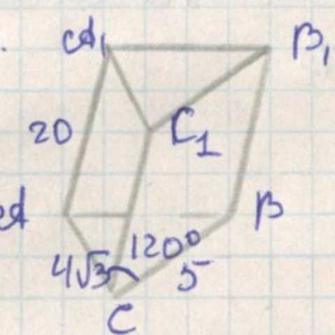 Объём призмы равен произведению площади основания на высоту. Площадь основания равна \( \frac{1}{2} \times 4\sqrt{3} \times 5 \times \sin 120^\circ = \frac{1}{2} \times 4\sqrt{3} \times 5 \times \frac{\sqrt{3}}{2} = 15 \) см². Высота призмы равна длине бокового ребра \( 20 \) см. Тогда объём равен \( 15 \times 20 = 300 \) см³.