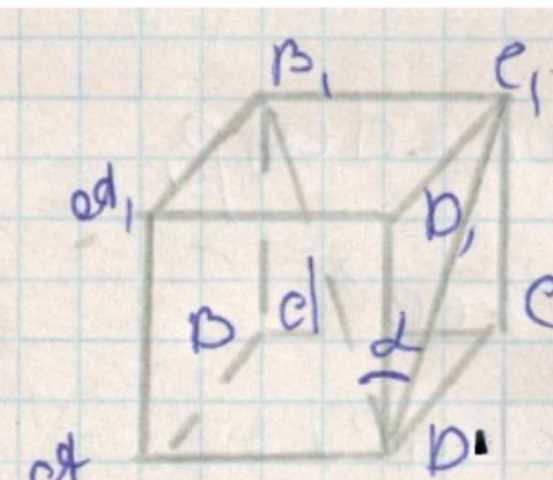 Далее рассмотрим треугольник, образованный сторонами основания и высотой призмы. По теореме Пифагора найдём длину стороны основания \(C C_1\). Она равна корню из разности квадратов проекции диагонали на основание и высоты боковой грани: \(C C_1^2 = D C^2 — B E_1^2\). Подставляя выражения через \(d\), получаем \(C C_1 = d \sqrt{\cos^2 \alpha — \sin^2 \alpha} = d \sqrt{\cos 2 \alpha}\).