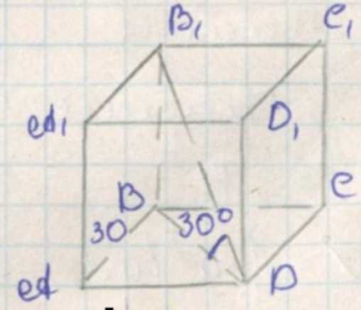 Диагональ основания \( d \) находится по теореме Пифагора: \( d = \sqrt{30^{2} + 40^{2}} = \sqrt{900 + 1600} = \sqrt{2500} = 50 \) см. Через эту диагональ проведена плоскость, которая параллельна диагонали параллелепипеда и образует с плоскостью основания угол 30°. Этот угол помогает определить высоту \( h \) параллелепипеда. Высота связана с диагональю основания и углом по формуле \( h = d \cdot \tan 30^{\circ} \). Так как \( \tan 30^{\circ} = \frac{1}{\sqrt{3}} \), то высота равна \( h = 50 \cdot \frac{1}{\sqrt{3}} = \frac{50 \sqrt{3}}{3} \) см.