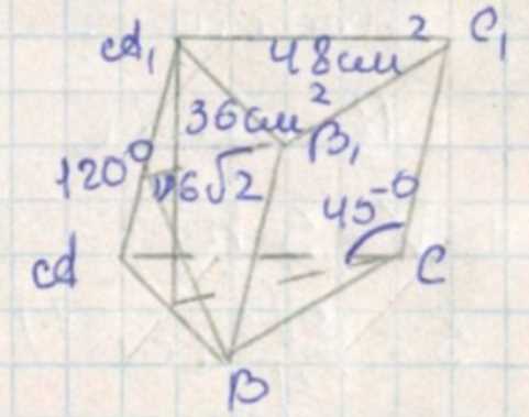 Поскольку двугранный угол при ребре \(AA_1\) равен 120°, площади боковых граней связаны через угол между ними. Для вычисления площади основания \(S\) используем формулу площади параллелограмма с учётом угла: \(S = \sqrt{S_1 \times S_2 \times \sin 120^\circ}\). Подставляем значения: \(S = \sqrt{36 \times 48 \times \frac{\sqrt{3}}{2}} = \sqrt{1728 \times \frac{\sqrt{3}}{2}} = 3 \sqrt{6}\) см².