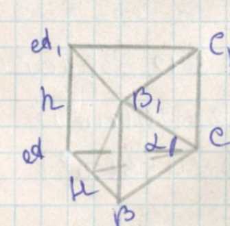 Объём призмы \(V = S \cdot h = \frac{\sqrt{3}}{4} a^2 h = \frac{\sqrt{3}}{4} \left(\frac{h}{\tan \alpha}\right)^2 h = \frac{\sqrt{3}}{4} h^3 \cot^2 \alpha\).