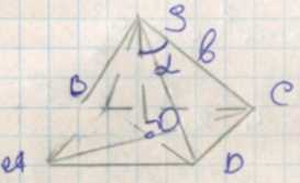 Из определения угла \(\alpha\) между боковым ребром \(SC = b\) и высотой \(SO\) следует, что \(\sin \alpha = \frac{OC}{b}\). Отсюда можно выразить половину стороны основания: \(OC = b \sin \alpha\). Поскольку основание — квадрат, сторона основания равна \(a = 2 OC = 2 b \sin \alpha\). Это даёт нам полный размер основания через известные величины.