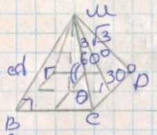 Прямоугольник \(ABCD\) — основание пирамиды \(MABCD\). Грани \(ABM\) и \(CBM\) перпендикулярны основанию пирамиды, грань \(ADM\) образует с основанием угол 60°, грань \(CDM\) — угол 30°. Высота пирамиды равна \(3\sqrt{3}\) см. Найдите объём пирамиды.