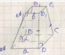 Высота \(h\) усечённой пирамиды связана с углом \(\alpha\), который образует одна из боковых граней с большим основанием. Поскольку одна из боковых граней является равнобокой трапецией и перпендикулярна основаниям, высота пирамиды равна длине боковой стороны, умноженной на тангенс угла \(\alpha\). В данном случае высота выражается как разность сторон оснований, умноженная на \(\tan \alpha\):