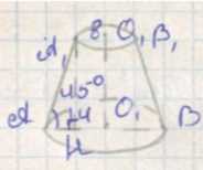 Обозначим радиусы оснований: \( R = 8 \) см, \( r = 14 \) см. Угол между образующей и плоскостью большего основания \( \alpha = 45^\circ \).