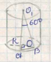 Далее, из центра верхнего основания хорда видна под углом 60°. Это условие позволяет связать высоту цилиндра \(h\) с радиусом \(R\). Рассмотрим треугольник, образованный центрами оснований и концами хорды. Угол в 60° указывает на то, что высота цилиндра равна радиусу основания, то есть \(h = R\). Это следует из геометрических соотношений в треугольнике, где угол и длина хорды задают пропорцию между высотой и радиусом.