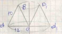 Основание треугольника \(b = 12\), боковая сторона \(a = 10\). Высота \(h = \sqrt{a^2 — \left(\frac{b}{2}\right)^2} = \sqrt{100 — 36} = 8\).