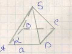 Высота конуса \( h \) выражается через угол между образующей конуса и плоскостью основания пирамиды, то есть через угол \( \beta \). Если образующая конуса наклонена под углом \( \beta \) к плоскости основания, то высота конуса находится по формуле: \( h = r \tan \beta \). Подставляя значение \( r \), получаем \( h = \frac{a \sin \alpha}{2} \tan \beta \).