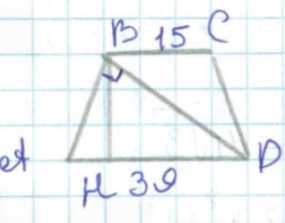 Основания трапеции \(BC = 15\), \(AD = 39\). Найдём \(AH = \frac{AD — BC}{2} = \frac{39 — 15}{2} = 12\).