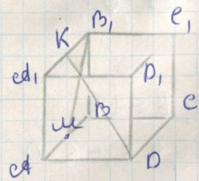 Косинус угла: \(\cos \theta = \frac{MB_1 \cdot DK}{|MB_1| |DK|} = \frac{\frac{5}{4}}{\frac{\sqrt{5}}{2} \cdot \frac{3}{2}} = \frac{5}{3 \sqrt{5}} = \frac{\sqrt{5}}{3}\).