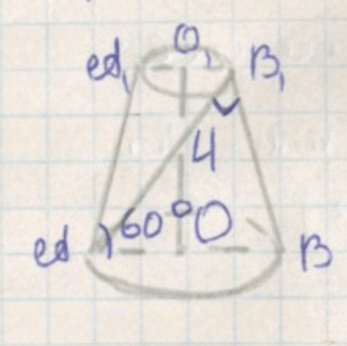Высота усечённого конуса \(h = 4\), угол между образующей и основанием \(60^\circ\). Длина образующей \(l = \frac{h}{\cos 60^\circ} = \frac{4}{\frac{1}{2}} = 8\).