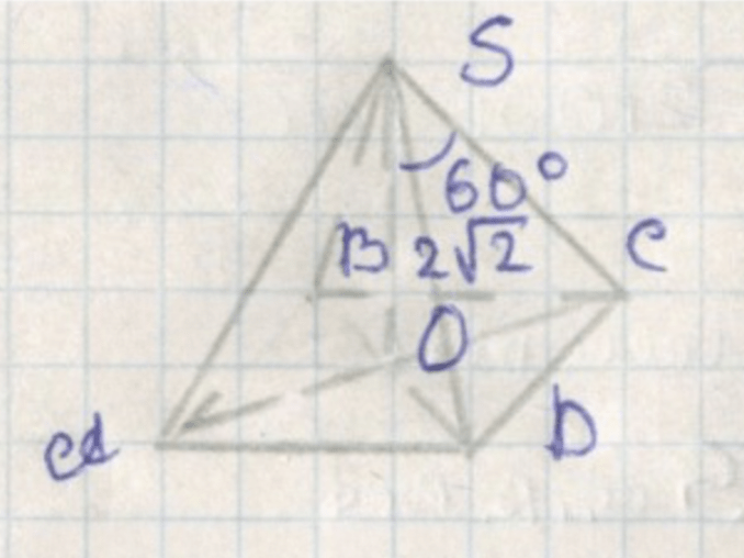 Пусть \(SO = 2\sqrt{2}\) — высота пирамиды, угол при вершине \(60^\circ\).