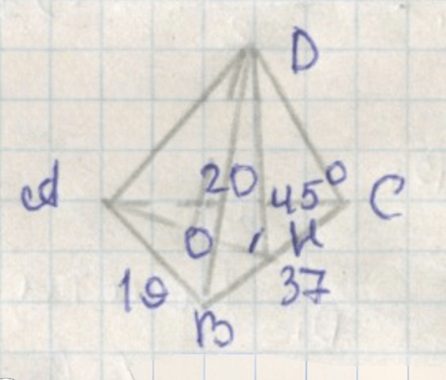 Основание пирамиды — треугольник со сторонами 19, 20 и 37 см. Площадь основания \(S\) по формуле Герона: \(p = \frac{19 + 20 + 37}{2} = 38\), \(S = \sqrt{38(38-19)(38-20)(38-37)} = \sqrt{38 \cdot 19 \cdot 18 \cdot 1} = \sqrt{13032}\).
