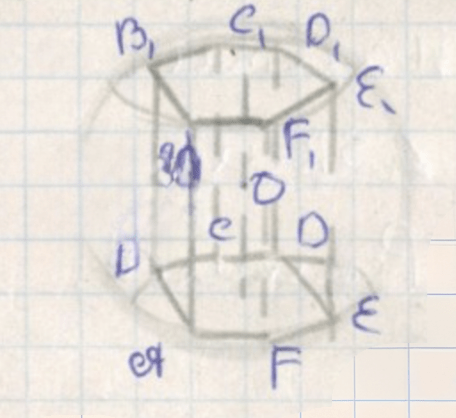 1. Правильная шестиугольная призма вписана в шар радиуса \( R = 4 \). Центр шара совпадает с серединой высоты призмы. Обозначим сторону основания призмы через \( a \), а высоту призмы через \( h \). Тогда вершина основания \( A \) имеет координаты \( (a, 0, 0) \), а центр шара — \( (0, 0, \frac{h}{2}) \). Расстояние от центра шара до вершины \( A \) равно радиусу шара, то есть \( R = \sqrt{a^2 + \left(\frac{h}{2}\right)^2} \), откуда следует уравнение \( 16 = a^2 + \frac{h^2}{4} \).