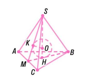 2. Для нахождения высоты тетраэдра рассмотрим треугольники \( \triangle SHM \) и \( \triangle SOK \). Из условия перпендикулярности \( SH \perp MH \), \( OK \perp SK \), а также подобия треугольников \( \triangle SMH \sim \triangle SOK \) следует равенство отношений: