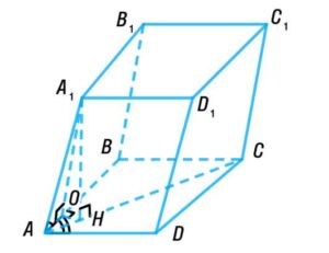 1. Дано, что стороны ромба \( AB = AA_1 = 4 \text{ см} \), угол при вершине \( \angle BAD = 60^\circ \), а углы при вершинах \( A_1 \) равны \( 45^\circ \), то есть \( \angle A_1AB = \angle A_1AD = 45^\circ \). В ромбе диагональ \( AC \) и высота \( A_1H \) перпендикулярны, то есть \( A_1H \perp AC \), а также высоты \( OH \) и \( A_1O \) перпендикулярны соответствующим сторонам \( AB \) и \( A_1O \perp AB \).