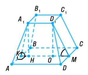 Вычислим длину отрезка \(HO\), который равен половине разности сторон оснований: \(HO = \frac{KM — A_1D_1}{2} = \frac{a — b}{2}\). Тогда высота усечённой пирамиды равна \(A_1H = KH \cdot \tan \angle A_1KH = \frac{(a — b) \tan \alpha}{2}\).