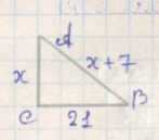 Пусть один катет \(x\), другой катет \(21\), гипотенуза \(x+7\). По теореме Пифагора:
