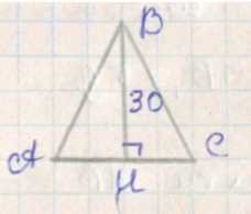 Дан равнобедренный треугольник \(ABC\) с основанием \(AC\) и боковыми сторонами \(AB\) и \(BC\). Периметр треугольника равен \(100\) см, а высота \(BH\), опущенная из вершины \(B\) на основание \(AC\), равна \(30\) см. Обозначим основание \(AC = x\), а боковые стороны \(AB = BC = y\). Так как высота в равнобедренном треугольнике, проведённая к основанию, делит его пополам, получаем: \(AH = HC = \frac{x}{2}\).